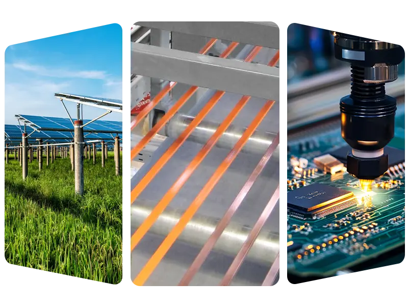 • ප්රකාශ වෝල්ටීයතා ක්ෂේත්රය: සංරචක විදුලිය කාර්යක්ෂමව සන්නයනය කිරීමට උපකාර කිරීම සඳහා ප්රකාශ වෝල්ටීයතා වෙල්ඩින් රිබන් සහ බස් බාර් විශාල වශයෙන් නිෂ්පාදනය කිරීම.